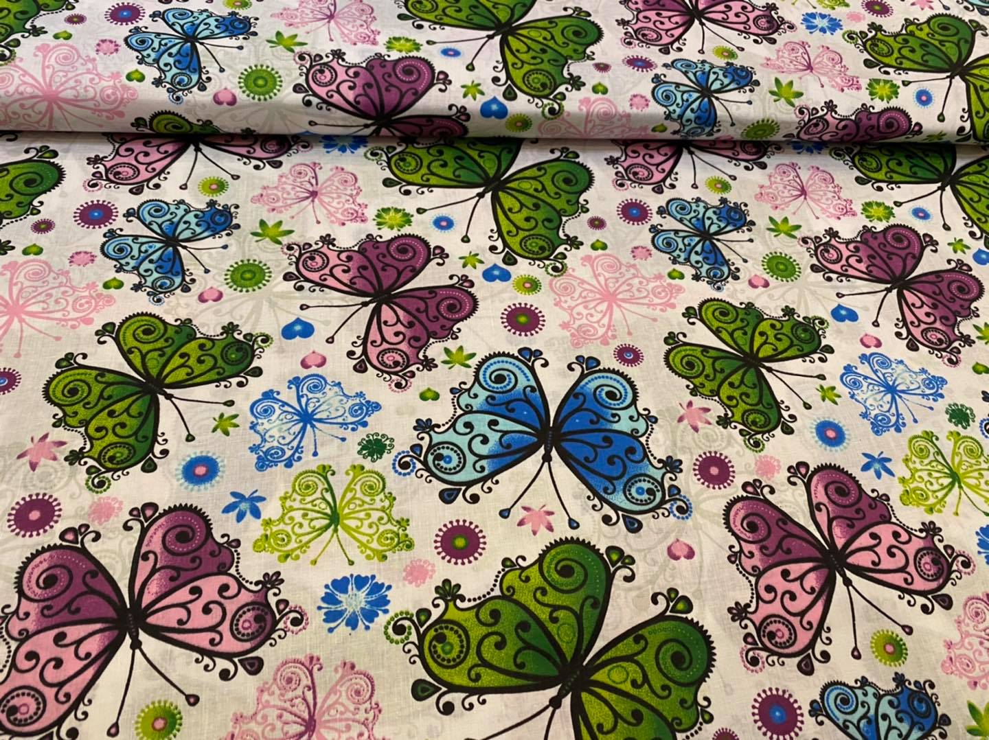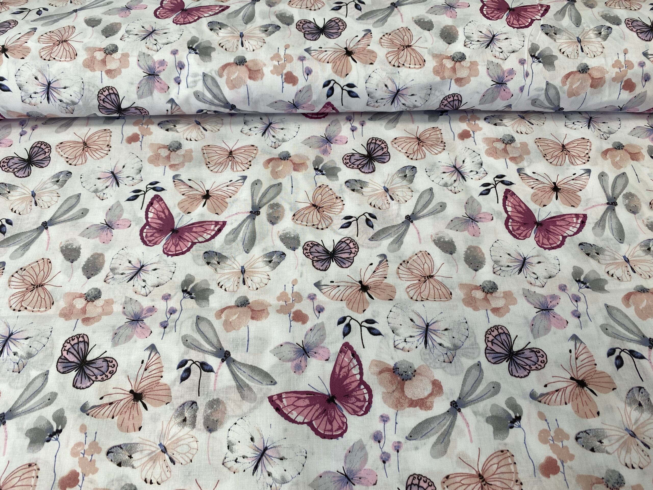 Taureņu apdruka vecrozā toņos, balts pamats