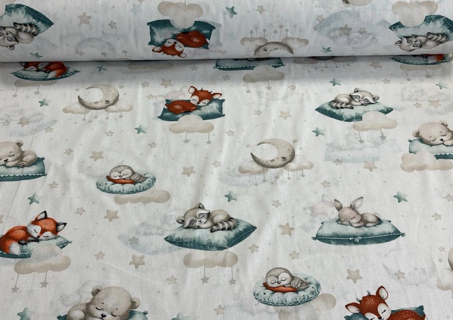 Guļošie zvēriņi ar zili zaļiem spilveniem, balts pamats